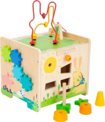 Deze hoogwaardige houten motorische kubus met illustraties van een konijntje en zijn vriendjes stimuleert kinderen om te ontdekken, traint de oog-handcoördinatie en ondersteunt de eerste muzikale ervaringen dankzij de ingebouwde xylofoon. Het bovenste deel met het kralenlabyrint kan eenvoudig worden verwijderd en omgekeerd zodat de kubus minder ruimte inneemt, of praktisch worden gebruikt als stoeltje.