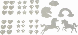 Creëer in een handomdraai een magische sfeer. De set fluorescerende decoraties met een eenhoornthema licht zacht op in het donker nadat ze aan licht zijn blootgesteld en verandert elke kinderkamer in een sprookjesrijk. De onderdelen bevestig je eenvoudig met kleefgum, die is inbegrepen.