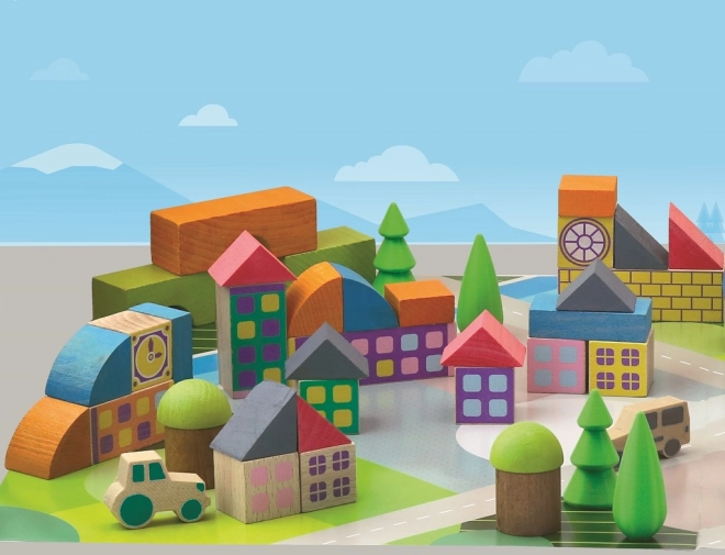 - 40 houten blokken + speelmat voor het bouwen van een dorpje