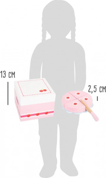 Kinderen kunnen de taart in stukken verdelen en weer samenvoegen dankzij het klittenband – ideaal om de fijne motoriek te oefenen en realistisch patisserie-spel te spelen.
