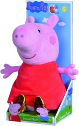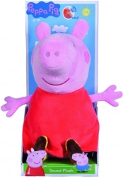 De geliefde heldin uit de serie Peppa Pig als pluchen vriendinnetje met geluid. Druk zachtjes op het buikje en Peppa laat grappige geluiden horen die het speelplezier vergroten en de kinderlijke verbeelding stimuleren. Het zachte materiaal is vriendelijk voor de gevoelige kinderhuid en nodigt uit om te knuffelen.