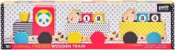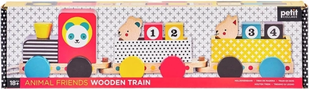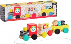 Dit moderne houten treintje heeft een locomotief en twee wagonnetjes, vier blokken met cijfers en twee schattige dierenvriendjes. Kinderen kunnen het aan het touwtje voorttrekken, blokken en figuren stapelen en verplaatsen, en zo hun verbeelding, logisch denken en zowel fijne als grove motoriek ontwikkelen.