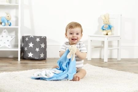 De blauwe buitenzijde en de binnenkant met print van illustraties naar Beatrix Potter maken van het knuffeldoekje een stijlvolle metgezel.