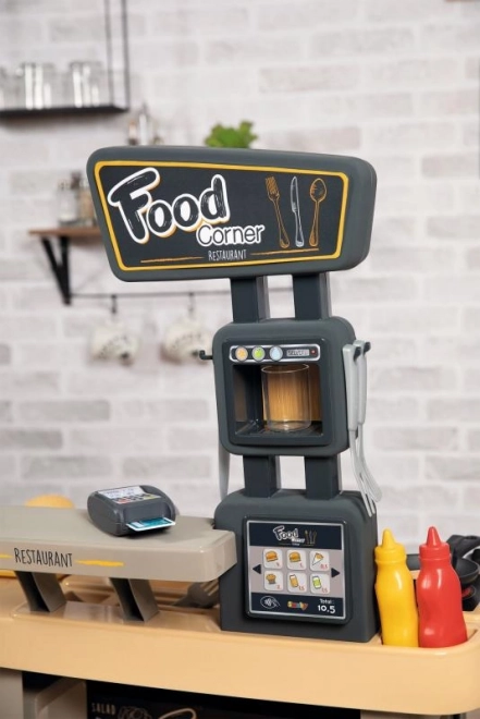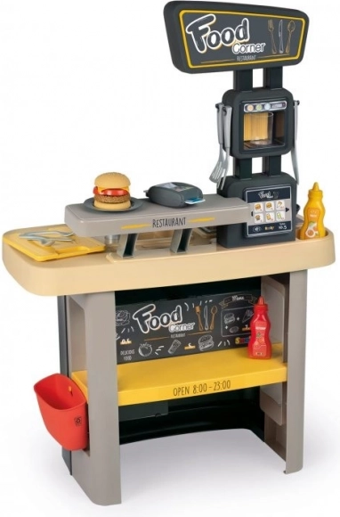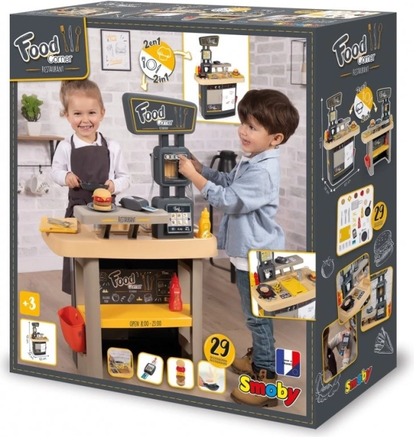 De Smoby Food Corner 2-in-1 kinderset tovert de kamer om tot een klein restaurant met een kook- én bedieningszone. Biedt realistische functies, rijke accessoires (29 stuks), kassa met betaalterminal en een menu voor het kiezen van gerechten – ideaal voor de ontwikkeling van fantasie, communicatie en samenwerking.