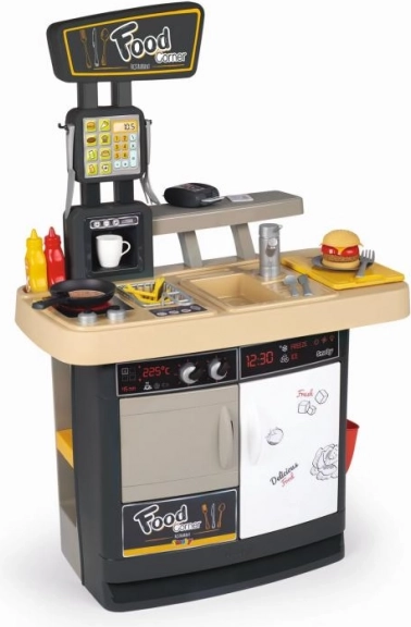 Open je eigen kleine fastfoodzaak! De Food Corner 2-in-1 van Smoby combineert een keukentje met een uitgiftebalie en kassa. Kinderen kunnen burgers, frietjes of pannenkoeken bereiden en tegelijk klanten aan de balie bedienen – net als in een echt restaurant.