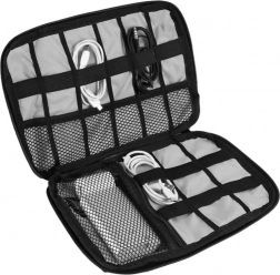 Deze grijze reisorganizer is de perfecte oplossing voor iedereen die elektronica-accessoires altijd bij de hand en netjes geordend wil hebben. Gemaakt van duurzaam polyester, met doordachte vakken, elastische banden en gaasvakken voor de veilige opslag van kabels, opladers, powerbanks, USB-sticks en geheugenkaarten. De kwalitatieve rits beschermt de inhoud tijdens vervoer.