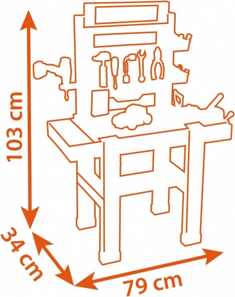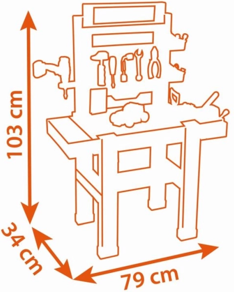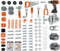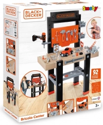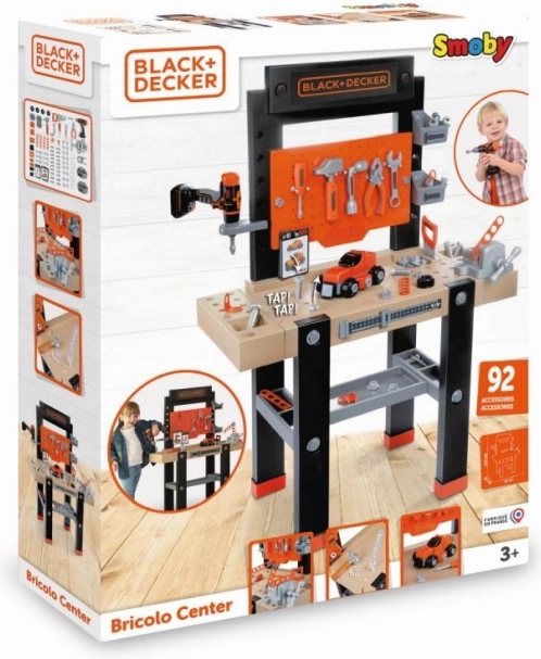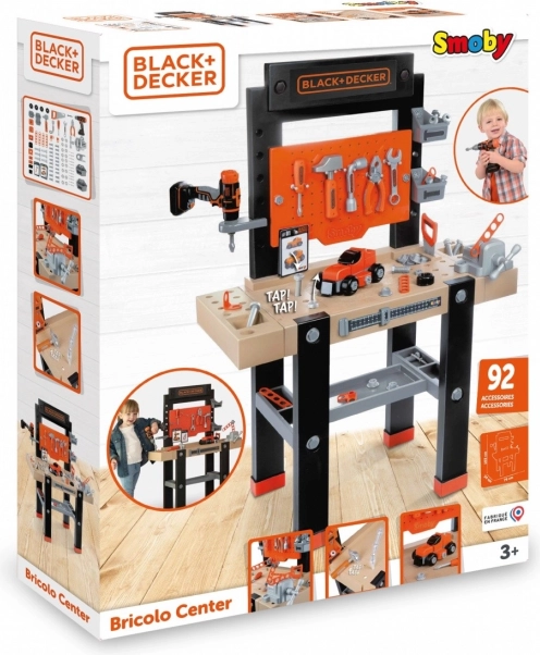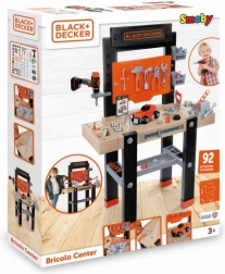 De grote kinderwerkbank BLACK+DECKER Bricolo Center van Smoby biedt een realistische werkplaats met 92 accessoires. Je vindt er een mechanische boormachine, een bankschroef, schroevendraaiers, een hamer, een zaag, een tang en zelfs een auto om te monteren. De stabiele constructie, praktische opbergruimte en afmetingen 103 × 79 × 34 cm stimuleren de ontwikkeling van motoriek en creativiteit bij kinderen vanaf 3 jaar.
