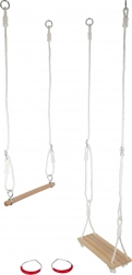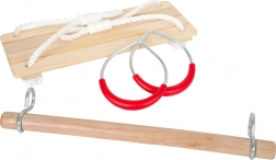 Deze multifunctionele set voor kleine acrobaten brengt actieve beweging en plezier naar de tuin én de kinderkamer. De klassieke houten schommel, hangende rekstok en gymringen met comfortabele kunststof grepen ondersteunen de ontwikkeling van coördinatie, kracht en evenwicht.