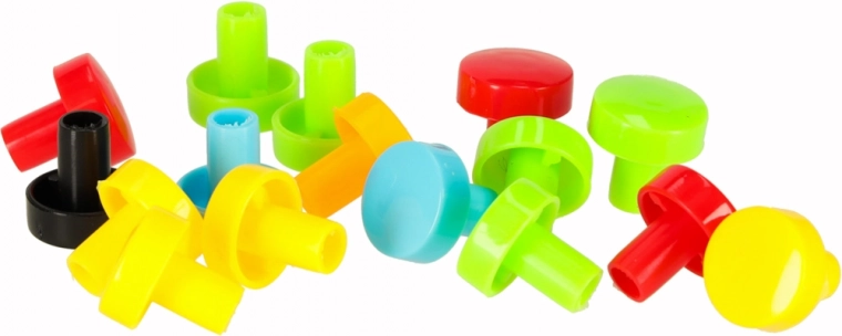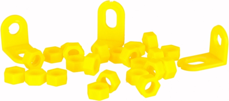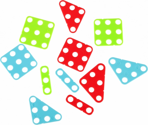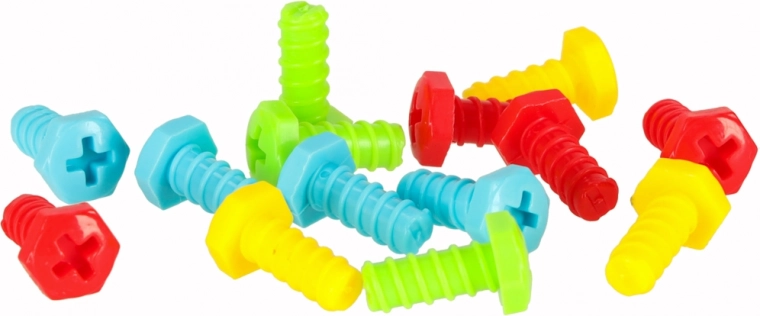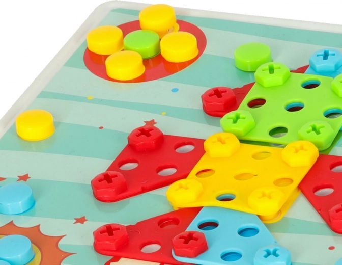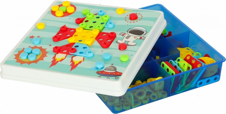 De grote set kleurrijke schroeven, plaatjes en vormdelen prikkelt de creativiteit en stimuleert zelfstandig maken van mozaïeken en modellen.