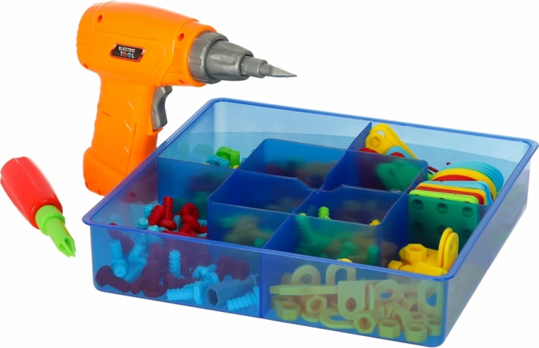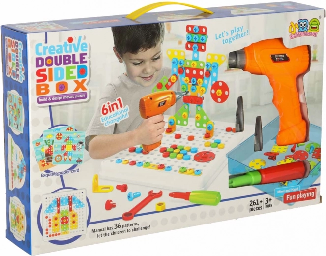 Leuke educatieve bouwset voor kleine doe-het-zelvers met een elektrische speelgoedboormachine, schroeven en een mozaïekbord. Kinderen oefenen hun fijne motoriek, creativiteit en technisch inzicht door kleurrijke patronen en eigen constructies te maken. De praktische koffer maakt meenemen gemakkelijk en de rijke set van 261 onderdelen zorgt voor uren speelplezier.