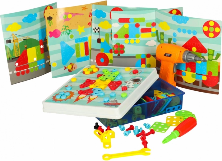 Met het mozaïekbord kunnen kinderen met de speelgoedboormachine, schroevendraaier en sleutel kleurige schroeven vastdraaien en allerlei afbeeldingen en 3D-modellen creëren. Breng de fantasie tot leven – de enige limiet is de verbeelding van de kleine constructeur.