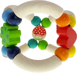 De houten rammelaar in de vorm van een vliegenzwam is gemaakt van hoogwaardig hout en een metalen belletje. De moderne kleurstelling en het gladde oppervlak zijn vriendelijk voor kinderhandjes, terwijl de lichte constructie het vastpakken vergemakkelijkt. Het speeltje is geschikt voor baby’s vanaf de geboorte en ondersteunt de zintuiglijke waarneming en de eerste gerichte bewegingen.