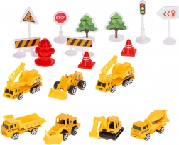 Inclusief graafmachine, betonmixer, bulldozer, kiepwagen, kraan en andere voertuigen, aangevuld met borden, pionnen en boompjes om eigen bouwplaatsen te creëren.