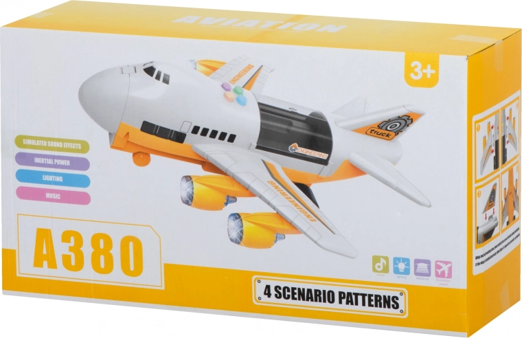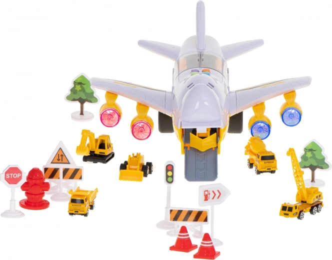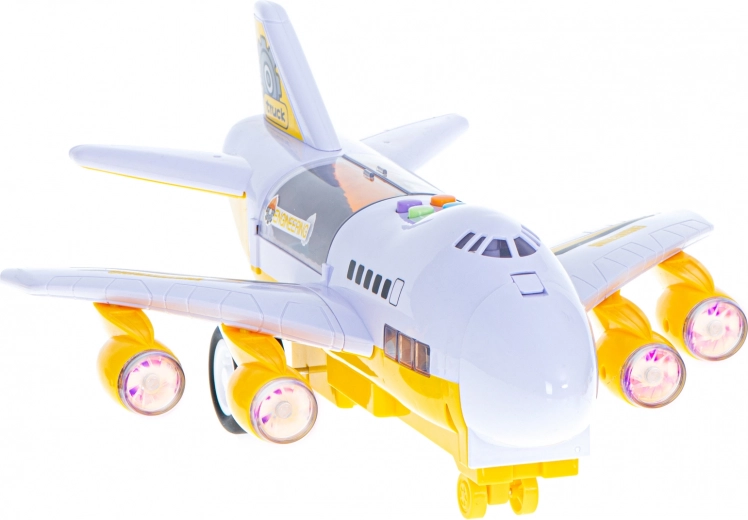Deze multifunctionele set combineert een transportvliegtuig met een mini-bouwwereld. Autootjes kunnen het vliegtuig inrijden via de neerklapbare voorste laadklep en dankzij het openende bovendek hebben kinderen gemakkelijk toegang tot de lading. De motoren lichten op met LED-lampen, wat de realistische speelervaring versterkt.