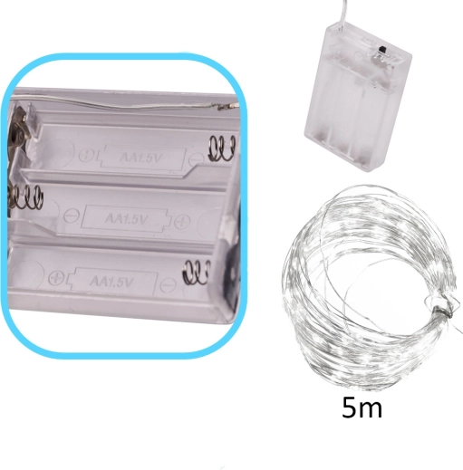 Creëer thuis een betoverende sfeer met een subtiele LED-lichtslinger op een dun draadje van 5 m met 50 diodes in koud wit. Dankzij de batterijvoeding plaats je hem overal zonder stopcontact, ideaal voor kerstdecoraties, in potten en flessen of als romantische sfeerverlichting het hele jaar door.