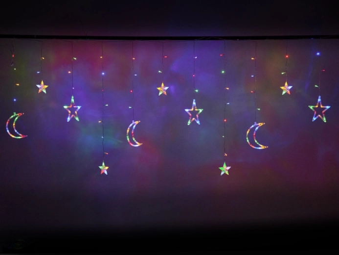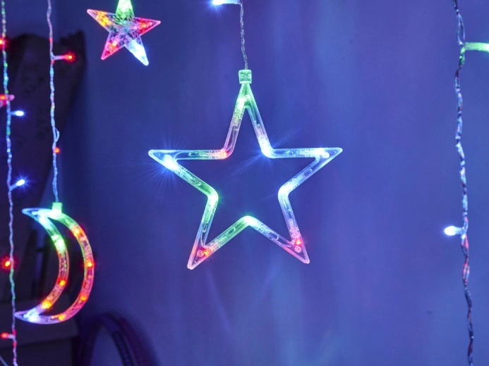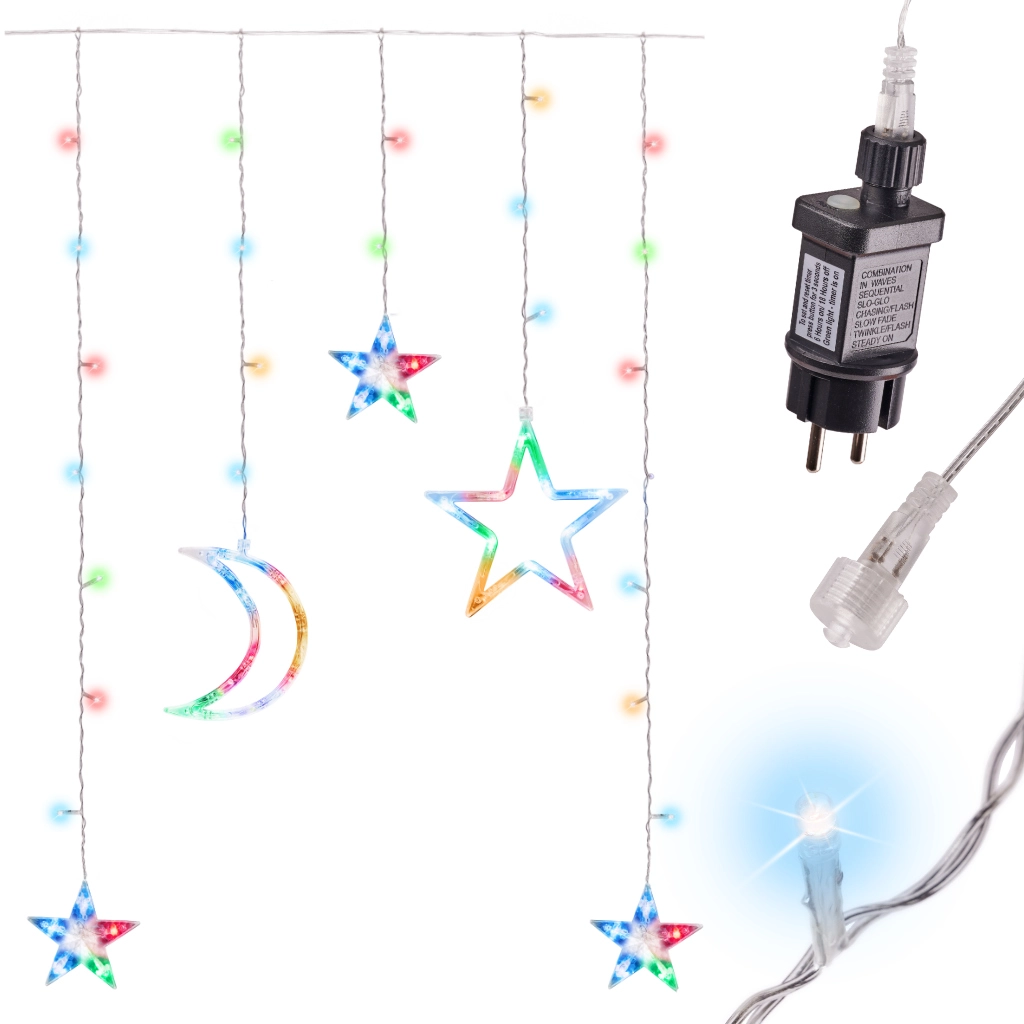 LED-lichtgordijn maan en sterren 2,5 m, 138 LED, multicolor. 8 modi, netvoeding, IP44, energiezuinige LED. Sprookjesachtige kerst- en jaarronde decoratie.