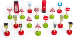 Ontdek een speelse set van 18 houten verkeersborden die elke treinbaan of stadsscène perfect aanvullen. Dankzij de stevige houten constructie en duidelijke symbolen begrijpen kinderen gemakkelijk de verkeersregels. De set is compatibel met de meeste houten treinen op de markt en ondersteunt de ontwikkeling van de verbeelding en de fijne motoriek. Hoogwaardig hout, veilige afwerking en educatief spel in één.