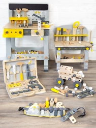 De verpakking bevat een ruime set accessoires: constructielatten en -platen met voorgeboorde gaten, blokken, wielen, wieladapters, afstandsbussen en twee houten gereedschappen – steeksleutel en schroevendraaier. Alles berg je overzichtelijk op in de praktische opbergbox, zodat er geen enkel onderdeel kwijtraakt.
