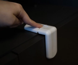Het mechanisme weerstaat trekken door kinderen en maakt het volwassenen tegelijk gemakkelijk om te openen door op de juiste plek te drukken.