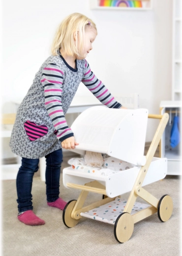 Ontdek een kwalitatieve poppenwagen die perfect past in elke kinderkamer. Combineert natuurhout, duurzame en afwasbare stoffen en een zachte kleurstelling. Het lage gewicht en de stabiele constructie zorgen voor een veilige rit, terwijl de rubberen wielen voor stille prestaties op elk oppervlak zorgen.