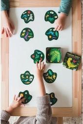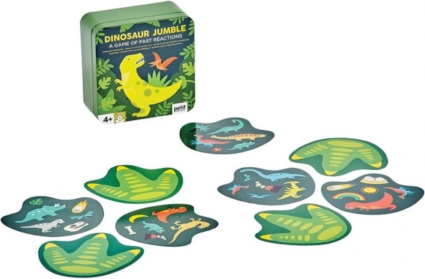 Train je reactievermogen met dinosaurussen. Dit kaartspel biedt tot vijf spelvarianten en zit vol kleurrijke illustraties met dinosaurus-thema. Je zult het zeker ook snel waarderen vanwege het compacte formaat, geschikt om thuis en onderweg te spelen. Verpakt in een metalen blikje zonder gebruik van plastic. Belangrijkste kenmerken voor 2–6 spelers 5 varianten van spelregels praktische verpakking Spelregels: Basisvariant: Deel aan elke speler één kaart met de afbeelding naar beneden. Plaats de stapel met de afbeelding naar boven tussen de spelers. Op een afgesproken signaal draaien de spelers hun kaarten om. De speler die als eerste het identieke symbool op zijn kaart en op de kaart van de stapel noemt, neemt de kaart van de stapel. Zo wordt de stapel uiteindelijk opgemaakt en de winnaar is de speler met de meeste kaarten. Omgekeerde variant: Verdeel de kaarten onder de spelers zodat iedereen hetzelfde aantal kaarten heeft en er één kaart overblijft. De spelers leggen hun kaartenstapel voor zich met de afbeelding naar beneden. Leg de overgebleven kaart met de afbeelding naar boven tussen de spelers. Op een afgesproken signaal draaien de spelers de bovenste kaart van hun stapel om. Wie als eerste het symbool noemt dat overeenkomt met zijn kaart en de kaart tussen de spelers, legt zijn kaart op de groeiende stapel in het midden en draait vervolgens zijn volgende bovenste kaart om. Het spel gaat zo door totdat er één speler met kaarten overblijft; die is de verliezer. De speler die als eerste al zijn kaarten heeft weggespeeld, is de winnaar. Groepsvariant: Er wordt in rondes gespeeld. In elke ronde krijgt elke speler één kaart met de afbeelding naar beneden. Op een afgesproken signaal draaien de spelers hun kaart om; wie als eerste een symbool noemt dat overeenkomt met het symbool op de kaart van een andere speler, geeft zijn kaart aan die speler. Het spel gaat door totdat één speler alle in die ronde uitgedeelde kaarten ontvangt. Het doel is om van je kaarten af te komen; de speler die in totaal over de rondes de meeste kaarten ontvangt, is de verliezer.