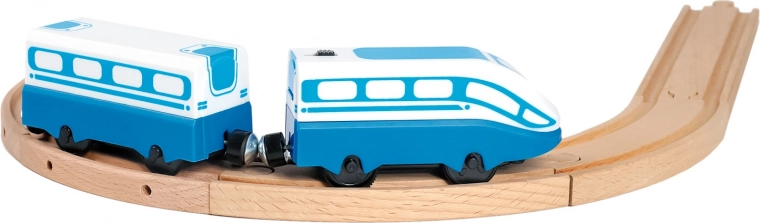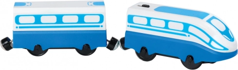 Deze hogesnelheids elektrische locomotief met wagon is de ideale aanvulling op elke houten treinbaan. Dankzij de compacte afmetingen, eenvoudige bediening en magnetische koppeling van de wagon biedt hij kinderen uren speelplezier en stimuleert hij tegelijkertijd de fijne motoriek en de verbeelding.