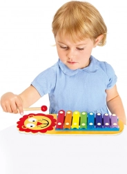 De kinderxylofoon met de vrolijke leeuwtjeslook brengt spelenderwijs leren en creatief musiceren samen. Acht kleurrijke metalen plaatjes op een houten basis klinken helder en prettig, zodat kinderen gemakkelijk tonen, ritmes en hun eerste melodieën ontdekken. In de verpakking zitten twee houten stokjes voor comfortabel spelen met beide handen.