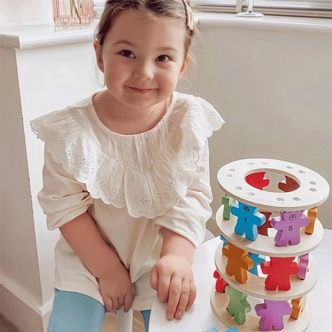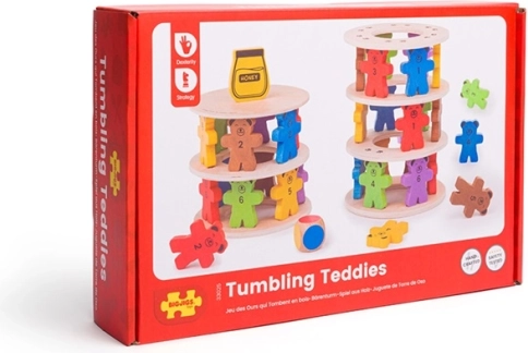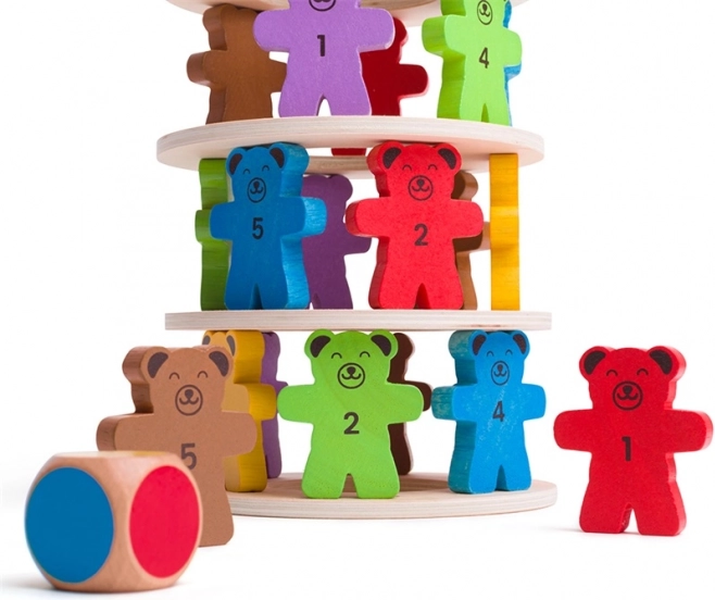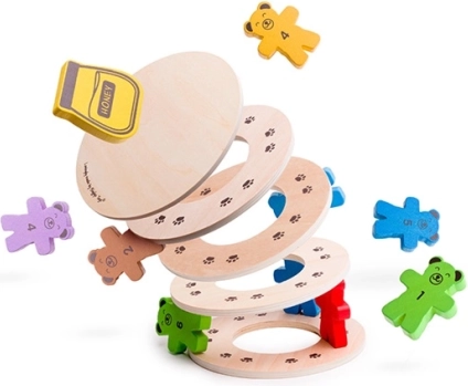 Ontdek de magie van de Vallende Beren, een leuk en tegelijk educatief houten spel voor kinderen. Dit spel helpt bij het ontwikkelen van fijne motoriek, strategisch denken en het herkennen van kleuren en cijfers. Jouw doel is om de berentoren zo hoog mogelijk te bouwen zonder dat deze omvalt.
