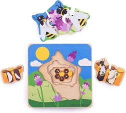De gelaagde opbouw met geleidelijk veranderende afbeeldingen toont de verschillende ontwikkelingsfasen – van ei tot volwassen bij. De stukjes zijn qua formaat afgestemd op kinderhanden en dankzij de stevige uitvoering bestand tegen veelvuldig gebruik.