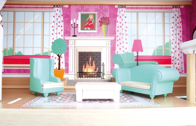 Het poppenhuis biedt een keuken, woonkamer, badkamer en slaapkamer, allemaal in een kleurrijke uitvoering met realistische accessoires voor een meeslepende speelervaring.