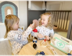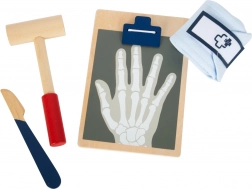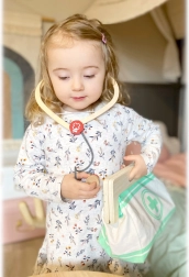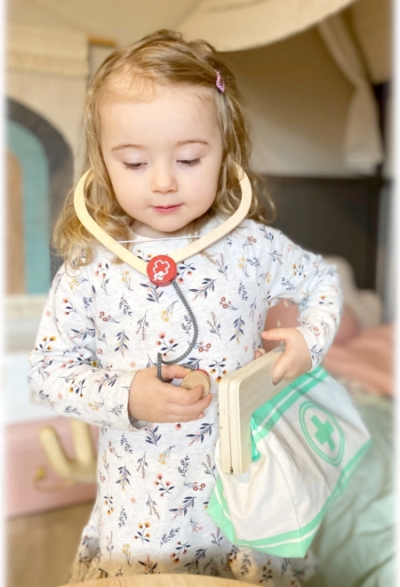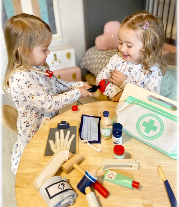De set bevat uitgebreide accessoires: stethoscoop, thermometer met instelbare temperatuur, injectiespuit met bewegend mechanisme, otoscoop met echte loep, maar ook een bloeddrukmeter met manchet en ballon, desinfectie met pompje, flesjes, lepeltje, pincet, scalpel, reflexhamertje en textielen mondkapjes. Kinderen kunnen een “patiënt” verzorgen, leren de basis van zorg en verminderen angst voor een doktersbezoek.