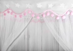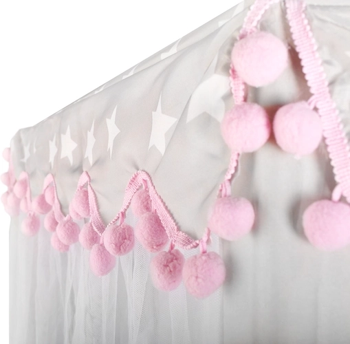 De grijs‑roze combinatie met sterren en decoratieve pompons betovert kinderen én ouders. Ziet er geweldig uit met extra verlichting.