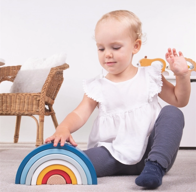 De houten stapelregenboog in levendige kleuren biedt kinderen eindeloze bouwmogelijkheden – van bruggen en tunnels tot fantasierijke constructies. Elke boog past precies in de andere, wat oog-handcoördinatie stimuleert en kinderen leert formaten en vormen te onderscheiden.