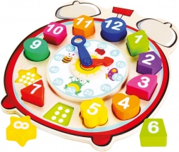 Dit multifunctionele houten leerspeelgoed combineert een inlegpuzzel met een klok. Kleurrijke stukjes van verschillende vormen met cijfers worden in de overeenkomstige openingen geplaatst, en onder de stukjes staan puntjes voor eenvoudige oriëntatie en eerste rekenoefeningen. Draaibare uur- en minuutwijzers helpen kinderen het principe van tijdmeting op een leuke en aanschouwelijke manier te begrijpen.