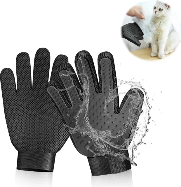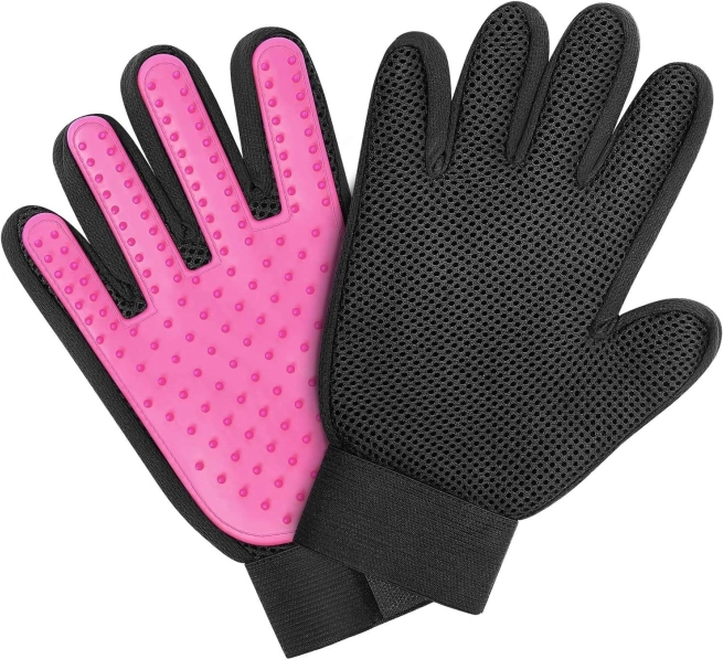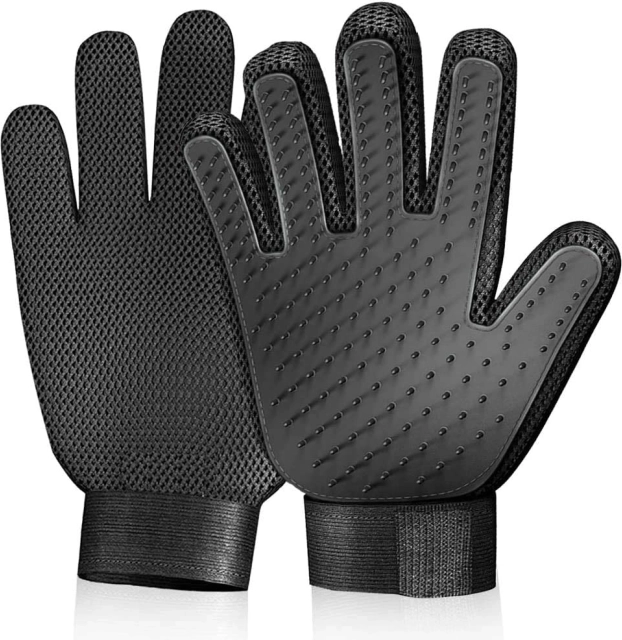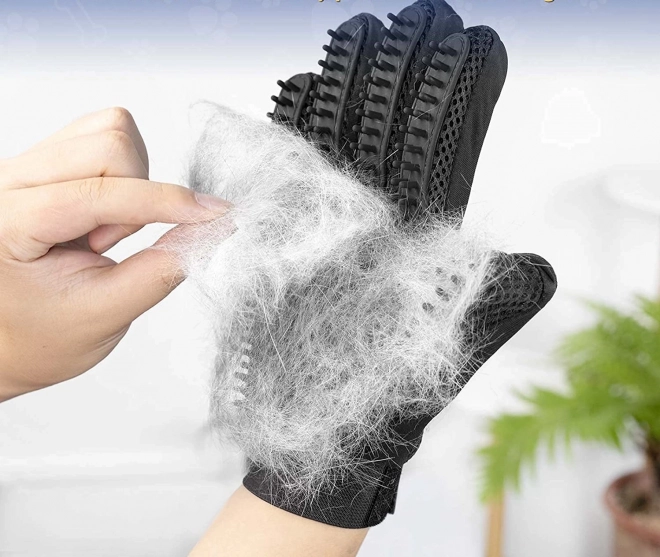 De uitgekamde haren blijven tussen de noppen zitten en na het kammen trek je ze er in één keer af. De handschoen maak je in een mum van tijd schoon met water en zeep.