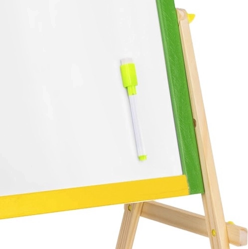 Dubbelzijdig houten bord voor kinderen met een zwarte en een witte (droog uitwisbare) zijde ondersteunt creativiteit, leren en fijne motoriek. Het gekleurde frame is van glad afgewerkt hout; de stabiele constructie wordt aangevuld met een praktische plank voor accessoires. In de set vind je een marker, spons en krijtjes – klaar voor direct gebruik.