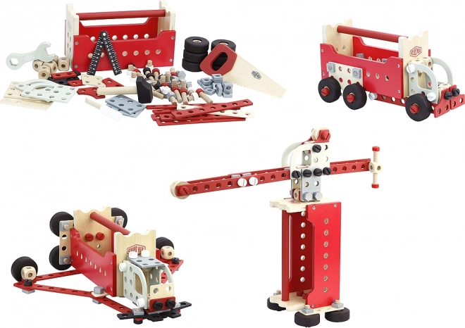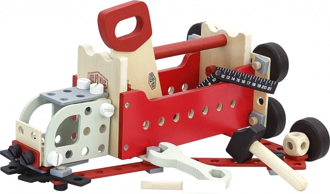 Zoekt u speelgoed dat de motorische vaardigheden en het creatieve denken van uw kinderen stimuleert? De dubbele gereedschapskoffer Vilac is de juiste keuze! Deze set bevat maar liefst 96 onderdelen, waarmee modulaire constructies zoals een vrachtwagen, een kraan of zelfs een robot kunnen worden gebouwd. Design Atelier Vilac garandeert hoogwaardige afwerking en een aantrekkelijke vintage look. Kinderen kunnen in de rol van kleine klusser stappen en hun speelgoedrijk laten stralen.