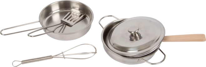 Bevat een pan met deksel, koekenpan, garde, spatel en houten lepel die helpen bij het spelen van kok.