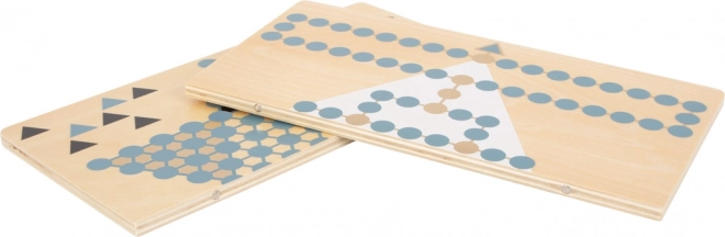 Ontdek de dubbelzijdige houten small foot Gold Edition die de klassiekers Halma en Barricade (Malefiz) combineert in een elegant design met gouden details, rookkleurig blauw, zwart, wit en naturel hout. De tweedelige, magnetisch gekoppelde speelbordhelften zorgen voor stabiliteit en eenvoudig opbergen in de stevige doos. Een geweldige keuze voor gezinsplezier, en ter bevordering van strategisch denken en concentratie.