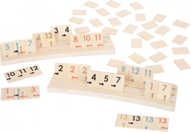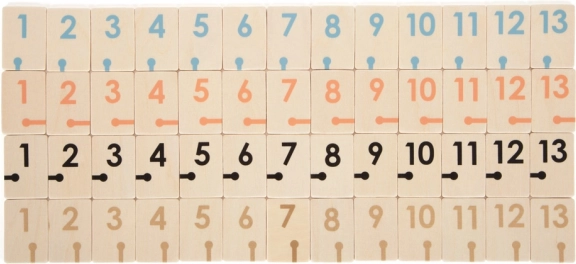 Massieve houten stenen met cijferopdruk en symbolen zijn duidelijk leesbaar en aangenaam om aan te raken. Voor stabiliteit en privacy bij het leggen van combinaties zorgen de licht gebogen houten standaards. Het spel bevordert logisch denken, strategie en concentratie bij spelers van alle leeftijden.