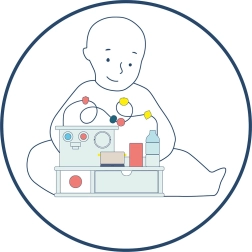 Draaiende knoppen, een pan met visje, een gootsteen met kranen en een openende oven prikkelen de fantasie en leren kinderen alledaagse keukenactiviteiten.