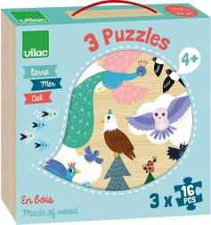 Set van 3 prachtig geïllustreerde houten puzzels, die scènes uit zee, land en lucht voorstellen. De illustraties zijn gemaakt door Michelle Carlslund, een bekende Deense illustratrice.