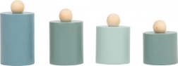Bevat 2 schalen en 4 glad afgewerkte gewichten in grijsblauwe tinten – ideaal voor het speelgoedwinkeltje en leren thuis.