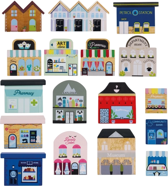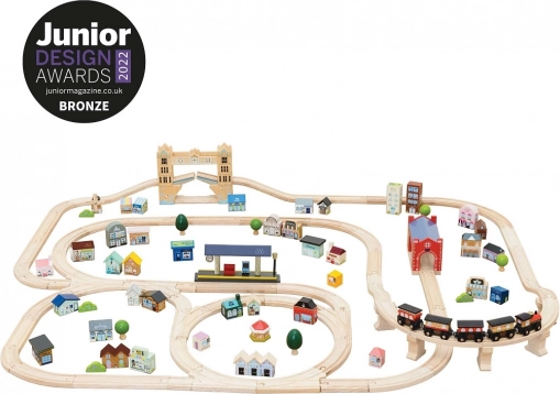 Deze grote houten treinbaan neemt kinderen mee naar het hart van een stad geïnspireerd op Londen. Dankzij de rijke uitrusting – van station en kleurrijke gebouwen tot de iconische ophaalbrug – biedt hij talloze speelscenario’s en stimuleert hij open, fantasierijk spel. Twee treinen met magnetische wagons koppelen eenvoudig en rijden veilig over de stabiele houten rails.