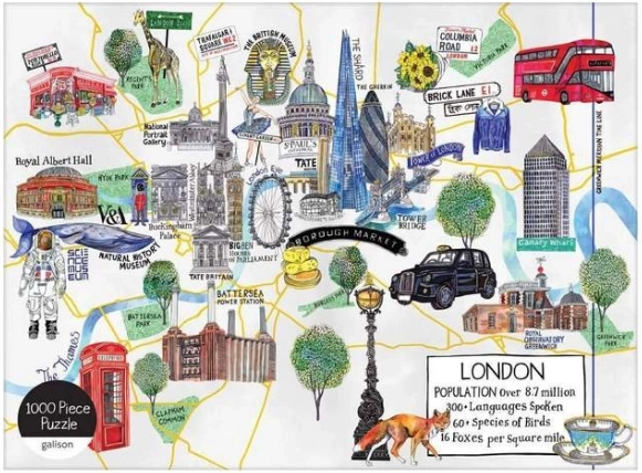 Deze designpuzzel toont een kleurrijke en gedetailleerde kaart van LONDEN met iconische bezienswaardigheden zoals Buckingham Palace, Trafalgar Square, Royal Albert Hall, Tower Bridge en het London Eye. De stijlvolle matte verpakking is zowel een mooi cadeau als een decoratief stuk voor in de boekenkast. Illustrator: Hennie Haworth.