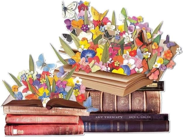 Duik in een creatieve wereld waar literatuur de natuur ontmoet. Kunstenaar Ben Gilles gaf het motief van bloeiende boeken een speelse collage, kleur en licht, wat de uiteindelijke afbeelding een unieke sfeer geeft. De voltooide puzzel is uniek gevormd en gecontourd tot aan de randen van het motief, zodat elk detail opvalt.