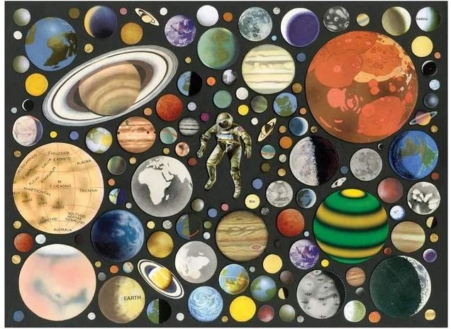 De puzzel toont het universum met kleurrijke planeten en een astronaut, wat zowel educatieve als decoratieve waarde biedt.
