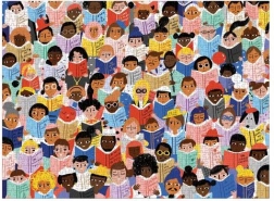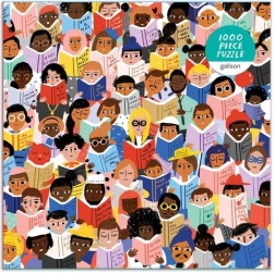 Het kleurrijke portret van boekenliefhebbers door Carolyn Suzuki maakt van elke puzzelsessie een visuele belevenis en plezier voor alle leeftijden.