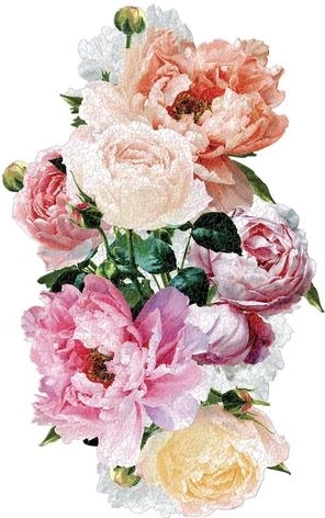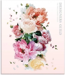 Een rijke compositie van pioenbloemen in pasteltinten geeft het voltooide beeld een subtiele elegantie en decoratieve uitstraling.