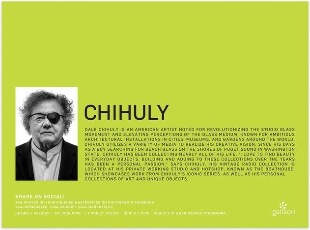 Stijlvolle puzzel met een motief van vintage draagbare radio’s, perfect voor designliefhebbers en verzamelaars. Kunstenaar Dale Chihuly liet zich inspireren door zijn levenslange collectie, wat resulteerde in een beeld vol details en kleur. Hoogwaardige druk en stevige stukjes van gerecycled papier zorgen voor een aangename puzzelervaring, elke keer weer.